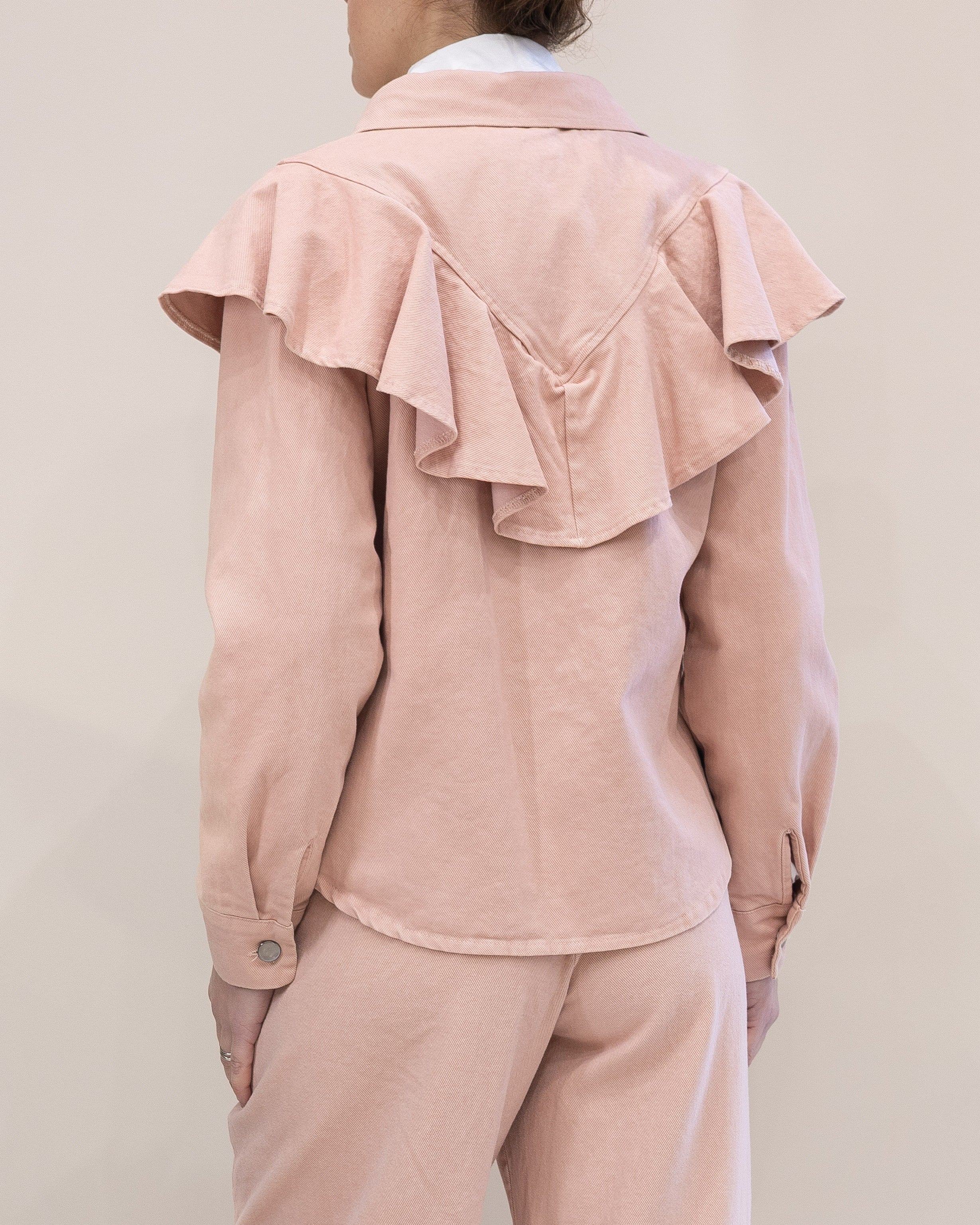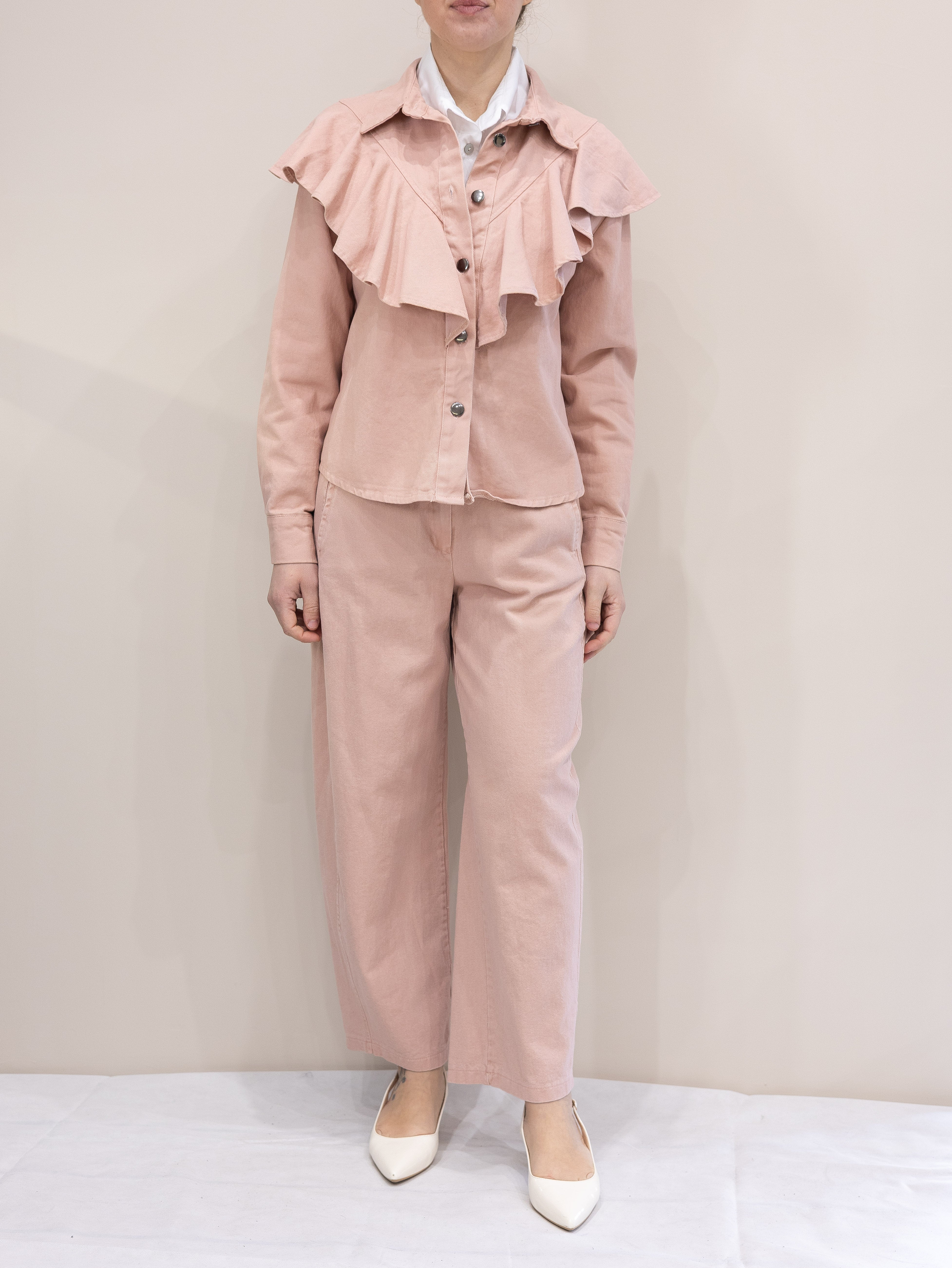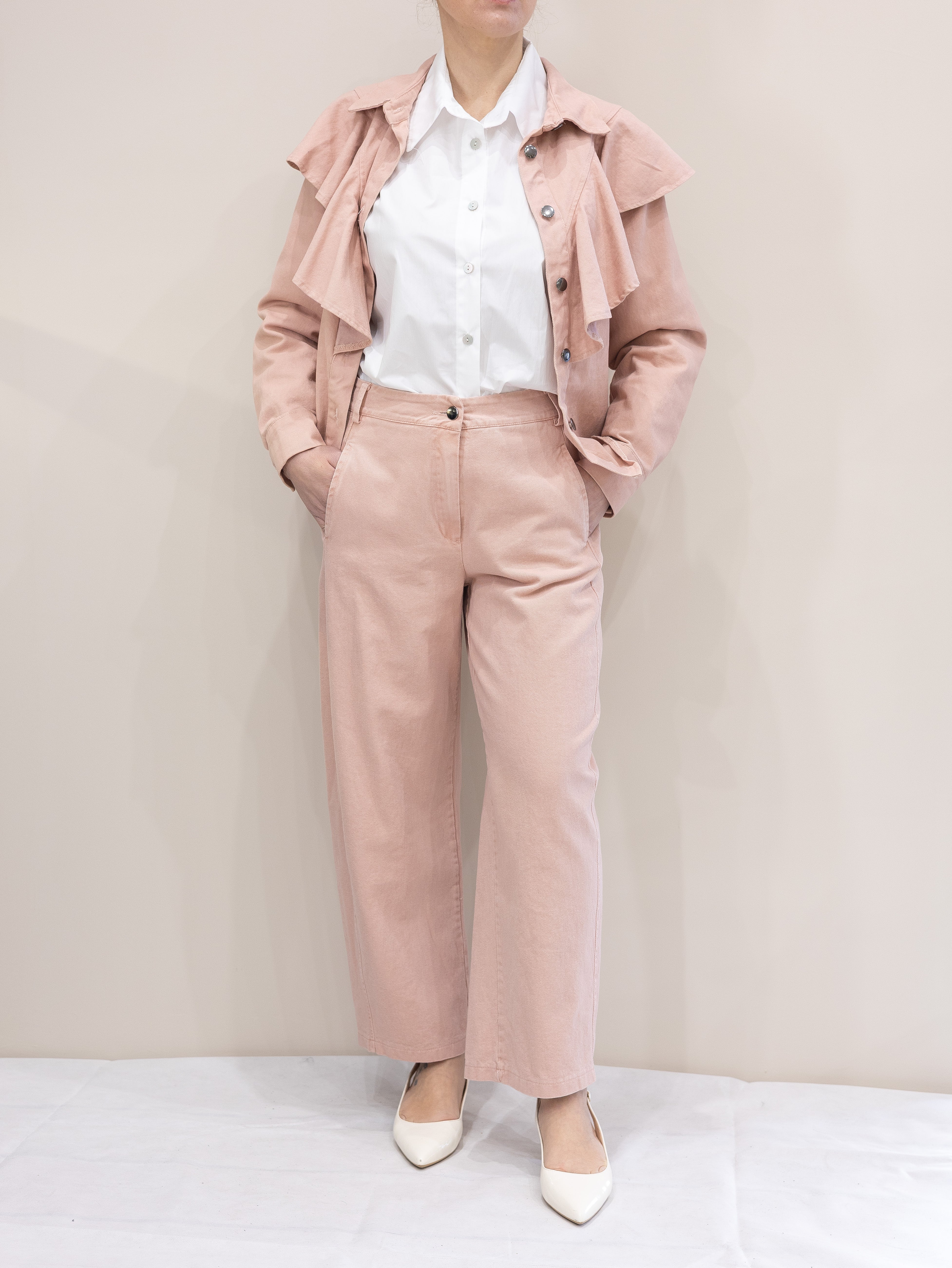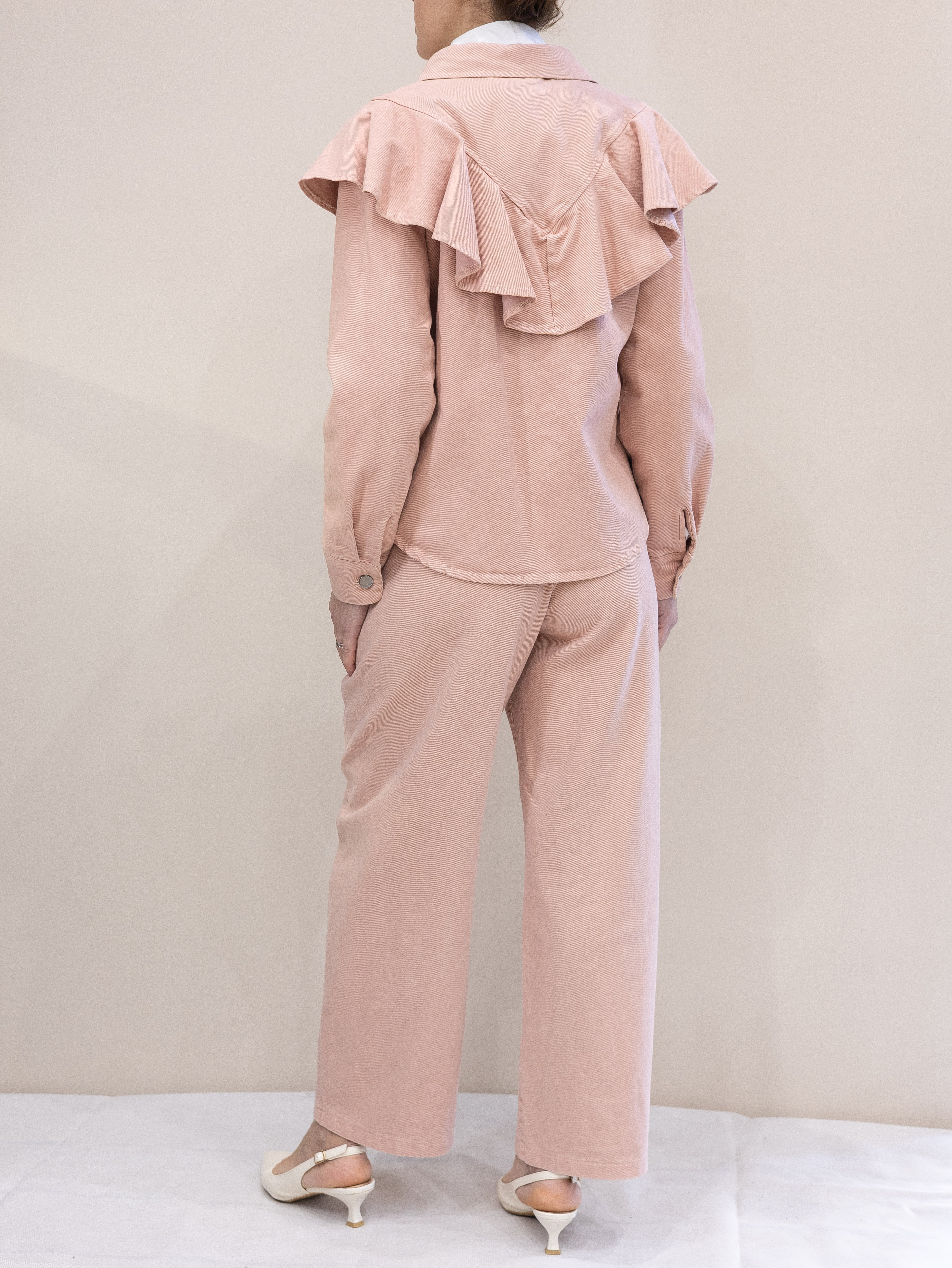 Set Coordinato Denim Rosa Cipria – Giacca con Rouches e Pantalone Wide Leg