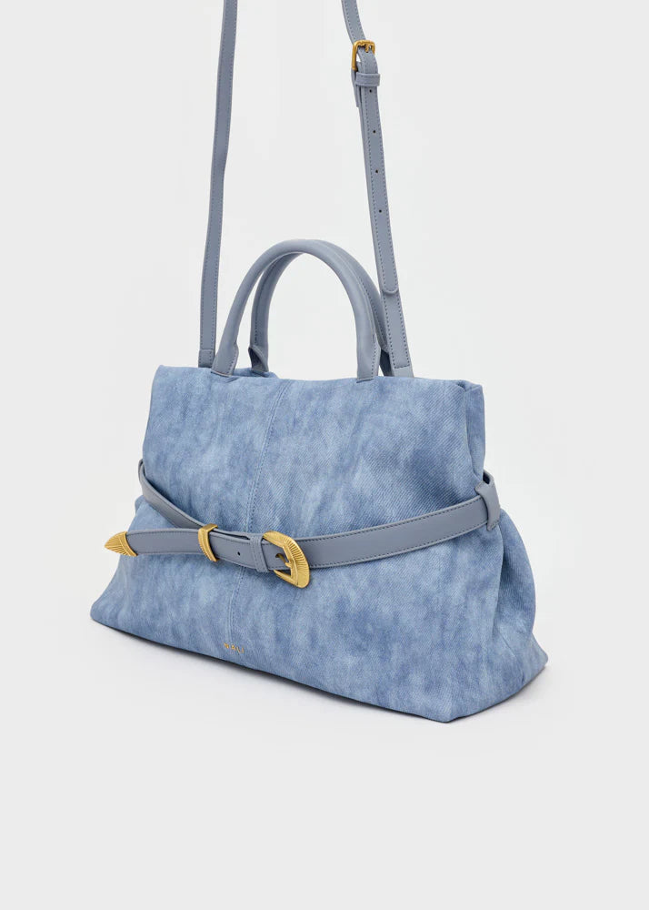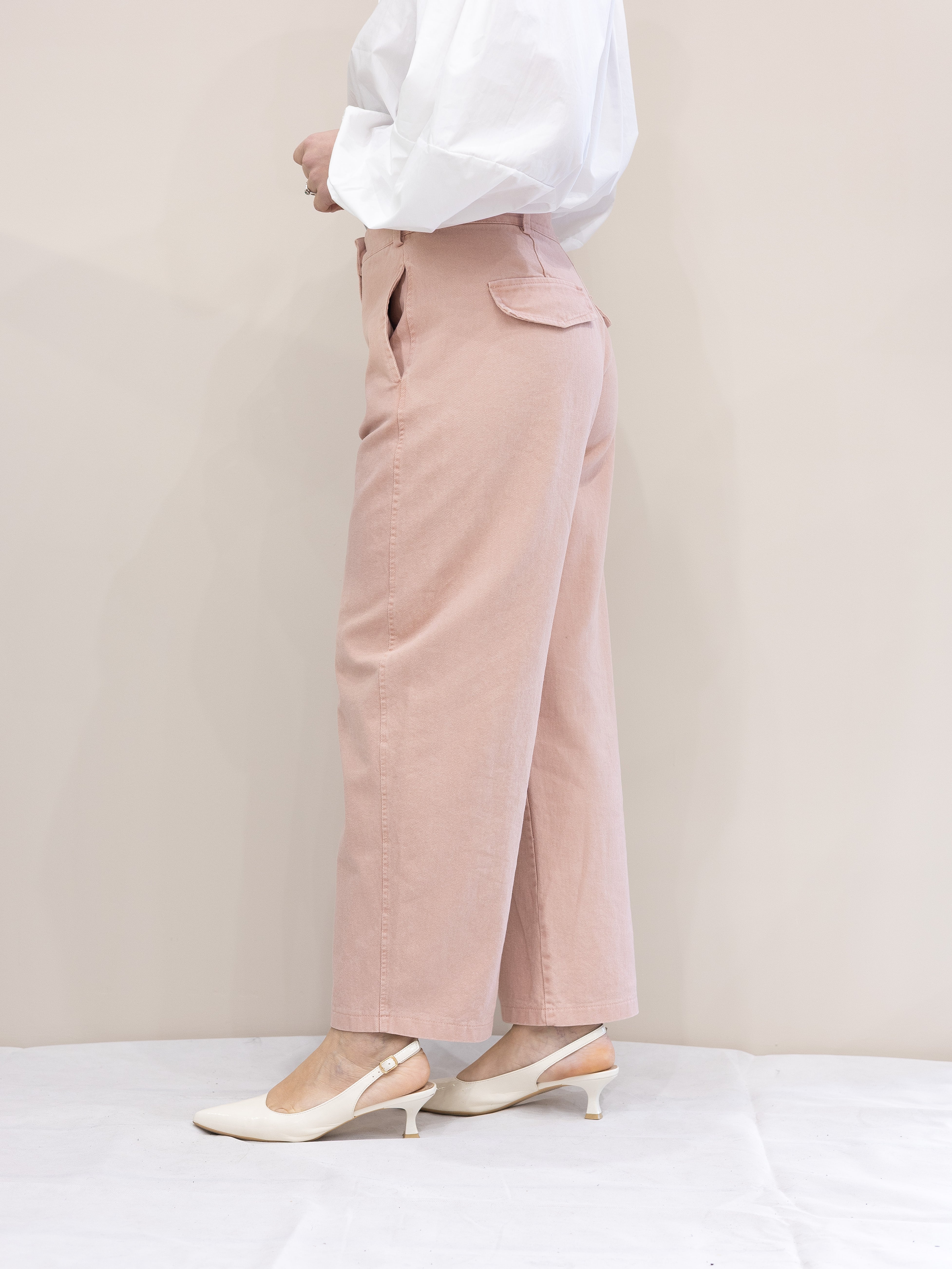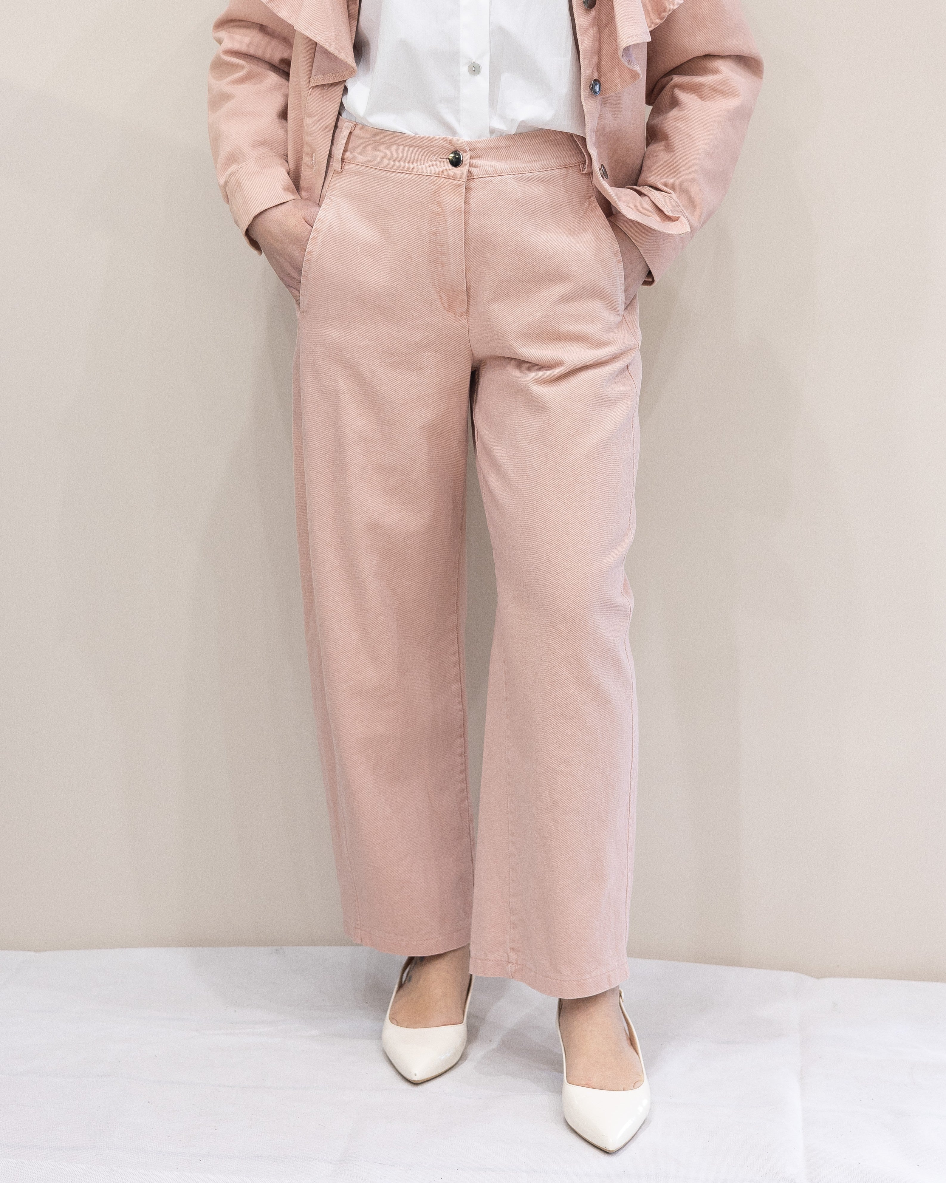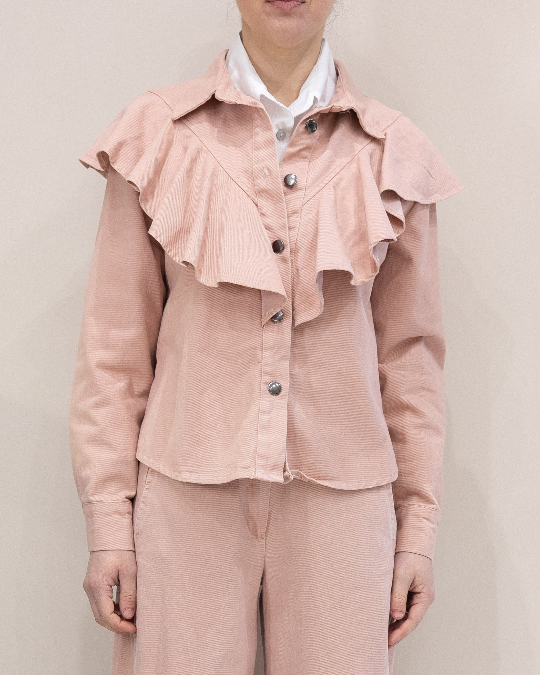 Set Coordinato Denim Rosa Cipria – Giacca con Rouches e Pantalone Wide Leg