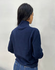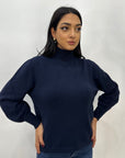 Maglia mezzo collo, con manica a sbuffo costine strette su polso e costine larghe su collo e fondo maglia.