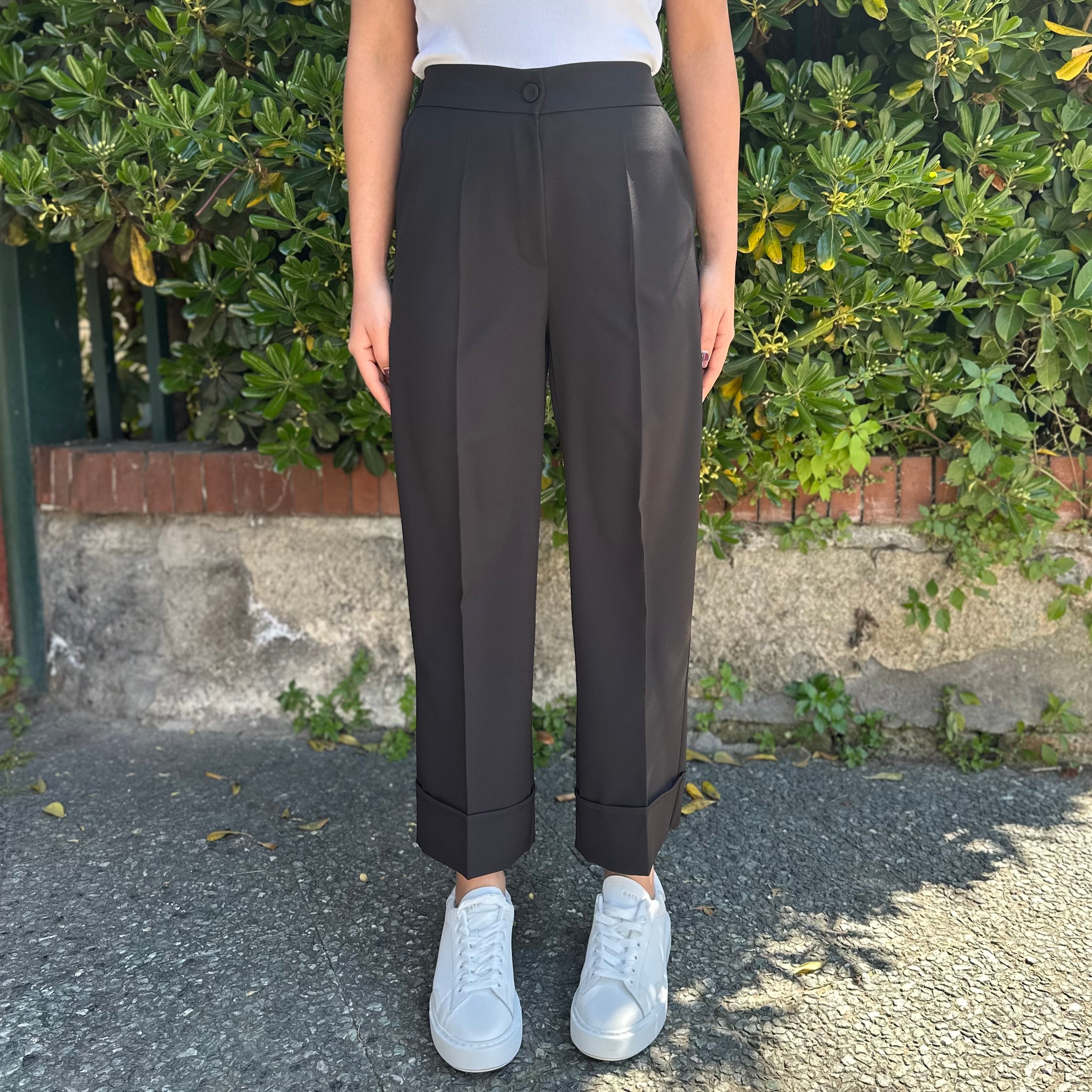 La sua linea pulita e i dettagli sartoriali conferiscono un tocco di sofisticatezza, rendendolo versatile per diverse occasioni. Un pratico elastico inserito nella parte posteriore della vita assicura una vestibilità confortevole e adattabile, mentre l'elegante piegone sul fondo aggiunge un dettaglio di stile ricercato. Vestibilità Regular la modella in foto indossa una taglia 40.