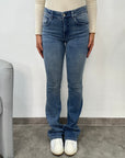 Blue denim per SCHIFFER_24 il jeans stile anni settenta che modella le forme e si apre a zampa sul fondo.